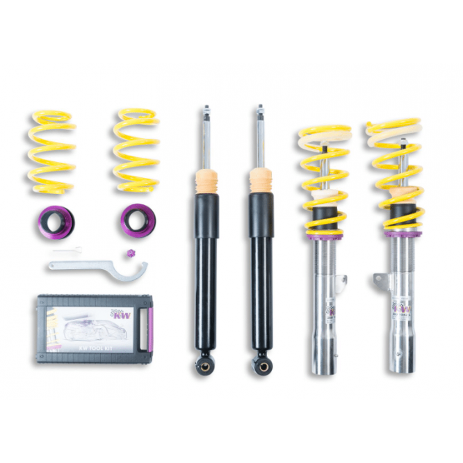 Premièrement, KW a plus de 15 ans d’expérience dans le développement des suspensions, de nombreux succès dans le sport automobile international. Des solutions individuelles de suspension et une puissance sont une innovation forte. KW compte, avec sa large gamme de suspension, parmi les leaders dans le marché de la seconde monte automobile du monde entier. Les valves hydrauliques haute technologie, suspensions sport, kits combinés filetés, systèmes électroniques de contrôle d’amortissement. Et d’innombrables autres composants, parce qu’ils maintiennent sous contrôle les masses suspendues ou pas et sont des parties intégrantes de la gamme étendue KW.